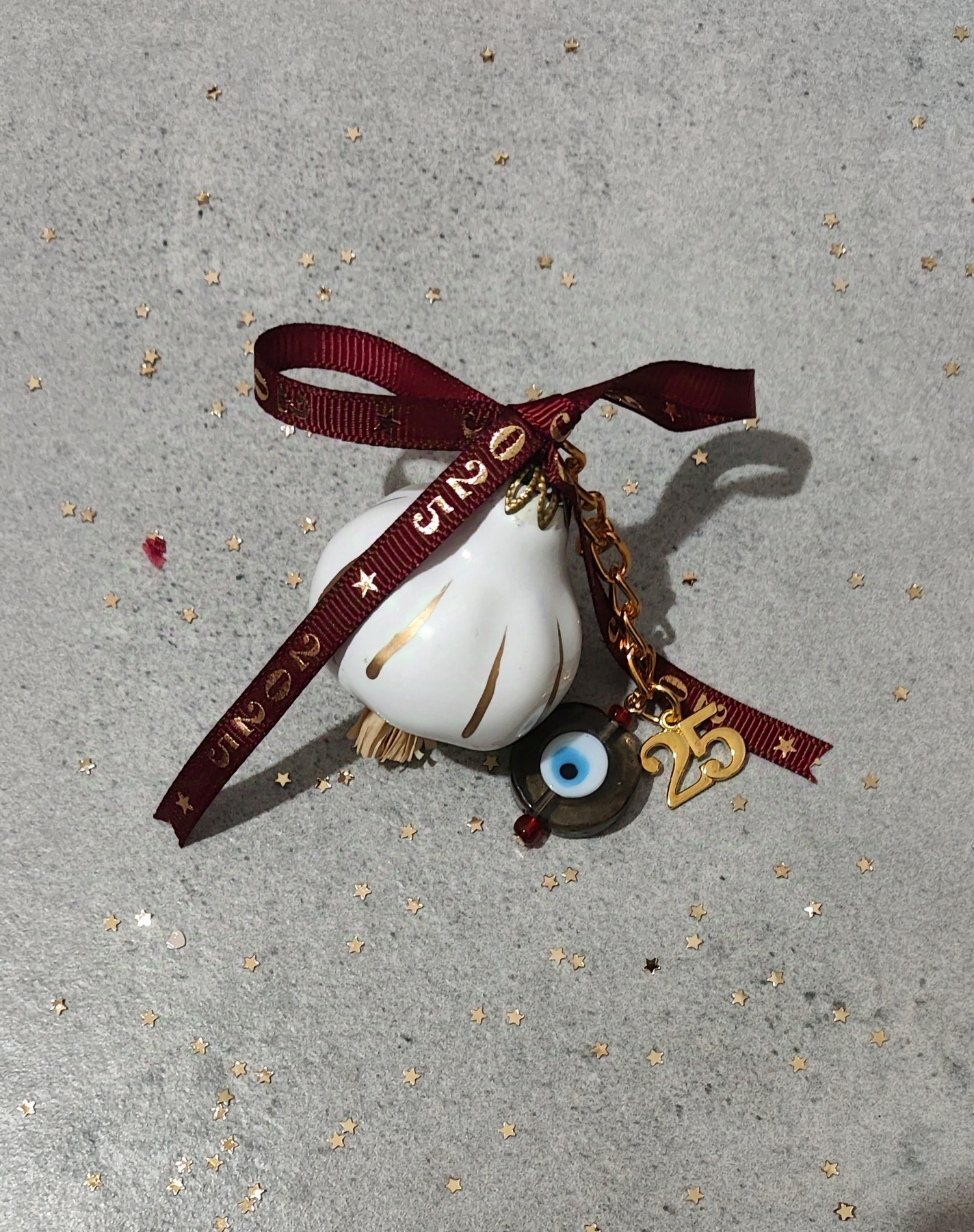 Γούρι τυχερό 2025 με κεραμικό σκόρδο για καλή τύχη.